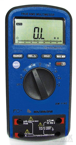 Мультиметр Актаком AM-1142 предназначен для измерений постоянного и переменного тока и напряжения, сопротивления, емкости, частоты, температуры, коэффициента заполнения, проверки диодов и прозвонки электрических цепей.