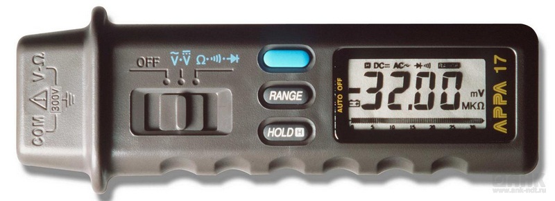 Мультиметр карандашного типа APPA 17A: Постоянное напряжение 4,2 В - 600 В; Переменное напряжение 4,2 В - 600 В; Сопротивление 420 Ом - 42 МОм; Цифровая (17-и линейная) шкала; Удержание показаний; Удержание max значений; Адаптация к сменн. преобразователю.