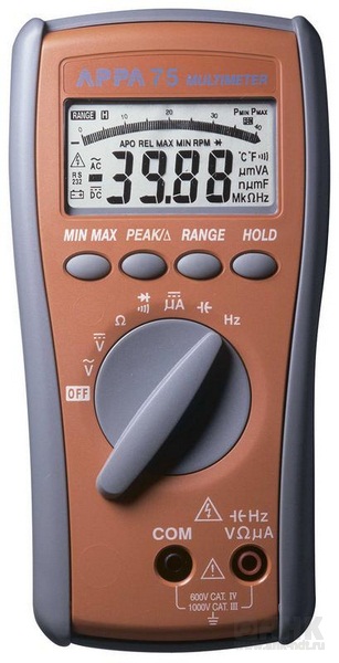 Мультиметр цифровой APPA 77 (APPA Technology Corporation): Постоянное напряжение 400 мВ - 1000 В; Переменное напряжение 400 мВ-750 В; Постоянный ток 400, 4000 мкА, 4, 10 А; Переменный ток 4, 10 А; Сопротивление 400 Ом-40 МОм; Ёмкость 4 нФ-40 мФ; Испытание p-n; Прозвон цепи и проверка диодов; Удержание показаний; min/max показания; REL измерения; Графическая линейная шкала; Дисплей 4 разряда (4000); Питание 9 В; Автоотключение; Противоударное исполнение (высота до 1,2 м). Аналог АРРА 75, дополнительный вход.