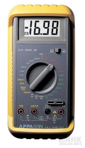 Мультиметр цифровой APPA 93N (APPA Technology Corporation): Постоянное напряжение 200 мВ - 600 В; Переменное напряжение 200 мВ - 600 В; Постоянный/переменный ток 200 мкА-20 А; Измерение сопротивления 200 Ом - 20 МОм; Измерение частоты 2 - 200 кГц; Измерение емкости 2 - 200 мкФ; Удержание показаний; Прозвон цепи; Испытание p-n; BeepGuard; Противоударное исполнение; Использование в любую погоду; Экстра-защита; Цветовая маркировка; Надежный переключатель.