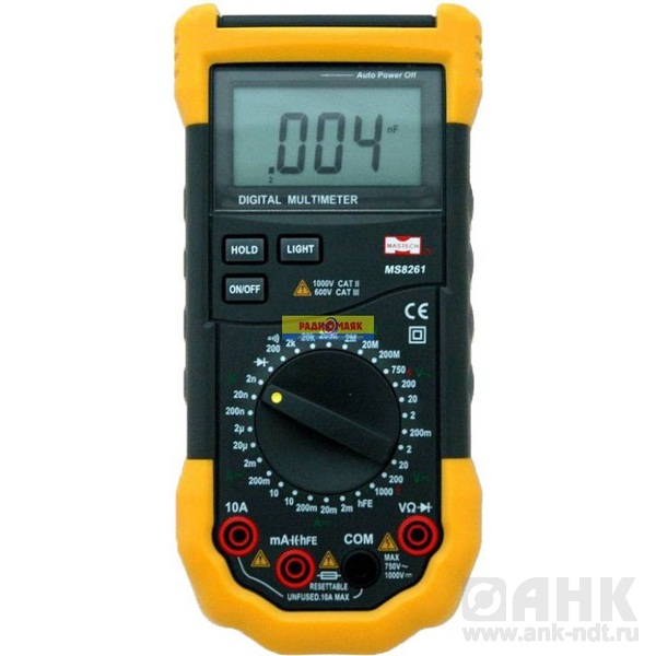 Цифровой мультиметр MS8261 позволяет измерять значения силы тока постоянного и переменного напряжения, значения постоянного и переменного напряжения, сопротивления, ёмкости конденсаторов и коэффициент усиления биполярных транзисторов.