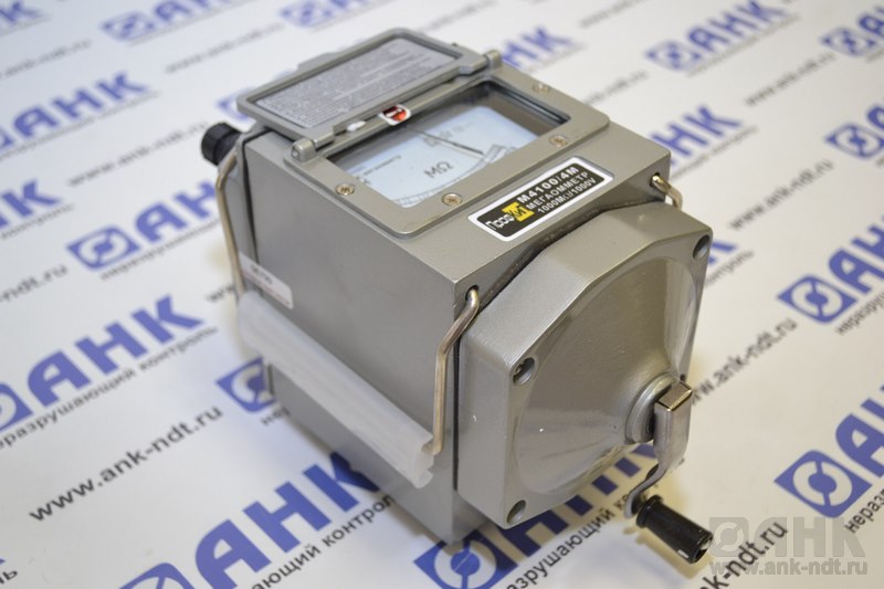 Мегаомметр ПрофКиП М4100/4М  (измеритель сопротивления изоляции ПрофКиП М4100/4М) предназначен для измерения сопротивления изоляции электрических цепей, не находящихся под напряжением. Мегаомметр ПрофКиП М4100/4М применяются для измерения сопротивления изоляции электрической проводов, кабелей, разъёмов, трансформаторов, обмоток электрических машин и других устройств, а также для измерения поверхностных и объемных сопротивлений изоляционных материалов.  Питание мегаомметра ПрофКиП М4100/4М осуществляется от встроенного электромеханического генератора.
