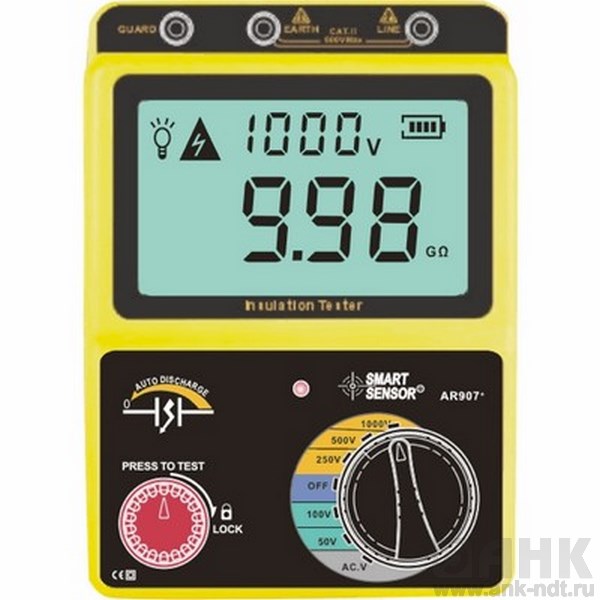 Тестер изоляции AR907+ может измерять сопротивление изоляции в диапазоне от 0 Ом до 20 ГОм. Тестер сопротивления изоляции позволяет производить измерение напряжением от 50В до 1000В, которое разбито на 5 фиксированных режимов. Помимо сопротивления, электрический тестер позволяет измерять напряжение электрической цепи.Тестер изоляции AR907+ при измерении выводит показания на ЖК-дисплей, оснащенный подсветкой.