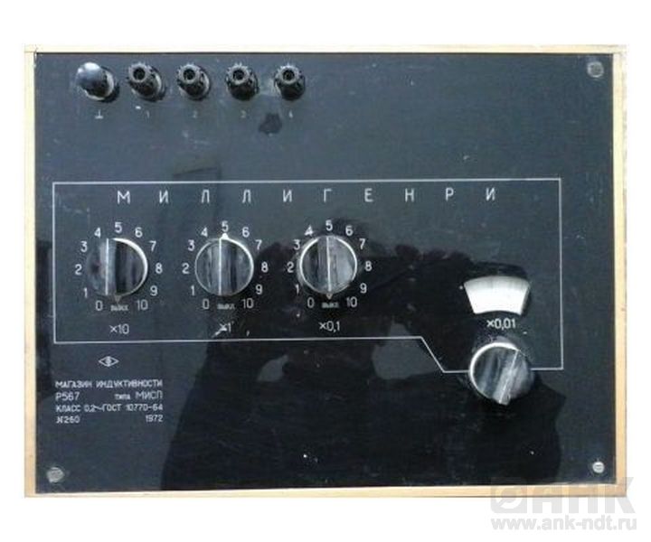 Магазин индуктивности  Р567 применяется в качестве меры индуктивности в измерительных схемах приборов переменного тока частотой 200000 Гц за исключением декады 100 мГн.