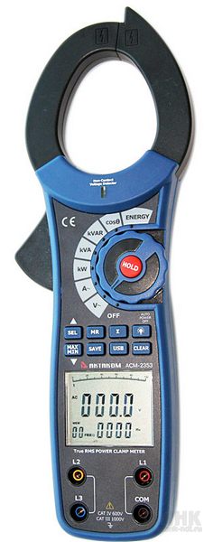 Профессиональные токоизмерительные клещи-ваттметр переменного (True RMS) тока АСМ-2353 для однофазных и трёхфазных сбалансированных нагрузок со встроенной памятью, функцией бесконтактного определения напряжения и USB-интерфейсом.