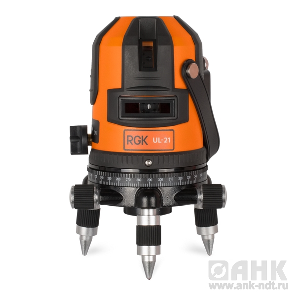 RGK UL-21 – это профессиональный лазерный нивелир, проецирующий три взаимно перпендикулярных плоскости: две вертикальных и одну горизонтальную с углом развёртки составляет 150°. Увеличенное число плоскостей сокращает число перестановок, а поворотный корпус с горизонтальным лимбом и двумя наводящими винтами позволяет с высокой точностью навести вертикальную плоскость или переместить горизонтальную на определённый угол.