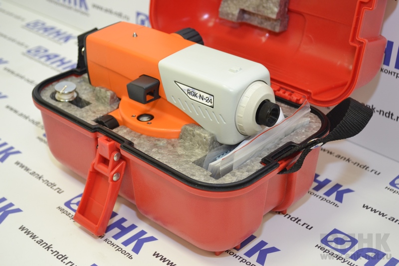 Стандартная комплектация: оптический нивелир RGK N-24, нитяной отвес, юстировочный набор, руководство по эксплуатации, транспортировочный кейс.