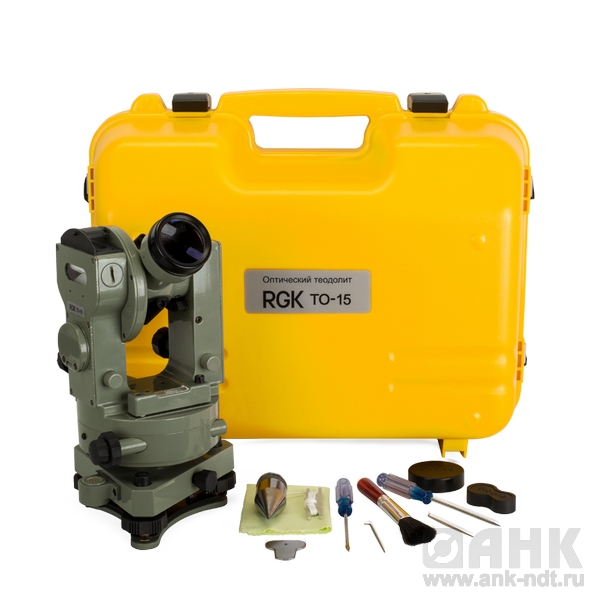 Стандартная комплектация: Оптический теодолит RGK TO-15, упаковочный футляр, отвёртка малая, бленда, кисточка, отвес, чехол, шпилька (2 шт.), инструкция по применению.