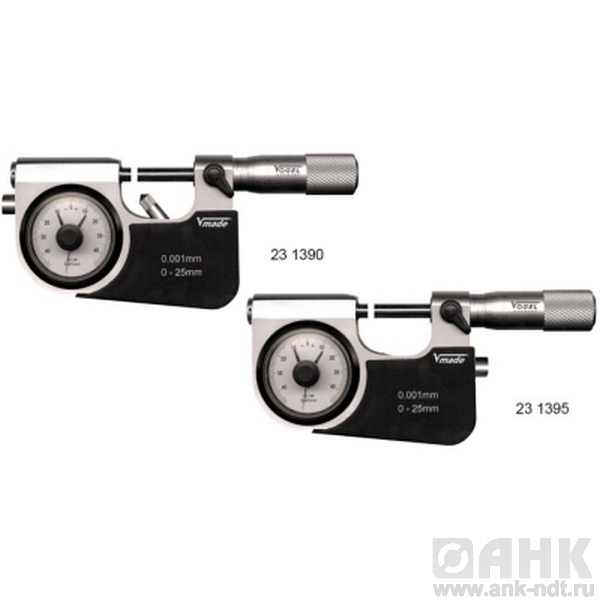 Микрометры Vogel рычажные с точной стрелкой диапазон измерений от 0-25х0,001 до 75-100х0,001 мм, для серийного производства, с полем допуска и циферблатом, предназначены для высокоточного определения линейных размеров. Измерение производится абсолютным или относительным контактным способом. Основным преимуществом инструмента является низкая погрешность, которая колеблется в промежутке значений от 2 до 50 мкм и зависит от класса точности микрометра, а также от измеряемого диапазона. В качестве преобразовательного механизма выступает так называемая микропара – винт и гайка.