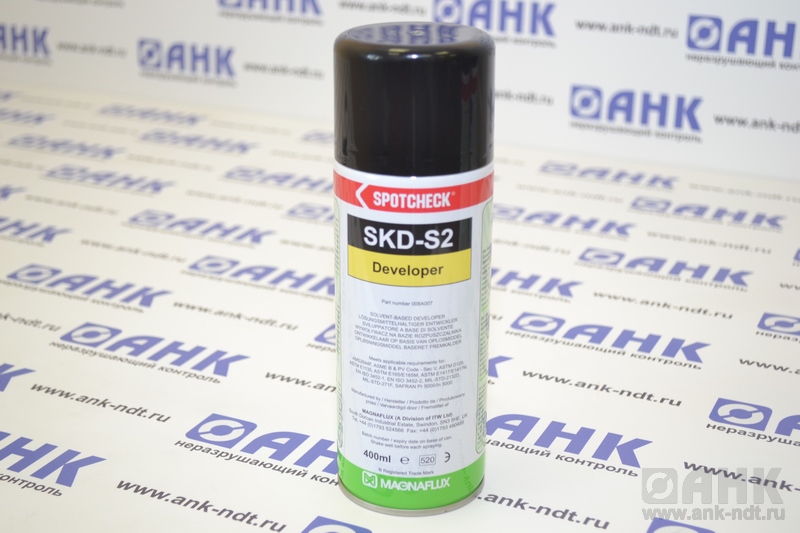 Белый суспензионный проявитель Spotcheсk SKD-S2 представляет собой белый сорбент, диспергированный в быстросохнущих растворителях и поглощающий индикаторный пенетрант. Проявитель SKD-S2 имеет слабый спиртовой запах, коррозионно не активен. SKD-S2 образует матовое белое покрытие, которое обеспечивает отличный контрастный фон для индикаторных рисунков пенетрантов MAGNAFLUX серий SрotcheckTM и ZygloTM. Обеспечивает повышенную чувствительность за счет растворяющего воздействия на пенетрант в месте расположения дефекта.