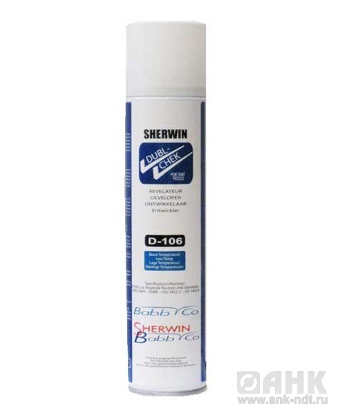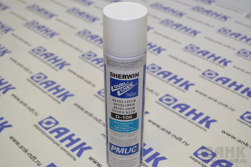 Проявитель Sherwin D-106, произведенный на органической основе, используется для усиления контраста и обнаружения следов от красных или люминесцентных пенетрантов при низких температурах в интервале -30°С ÷ +10°С. Применяется для капиллярного неразрушающего контроля.