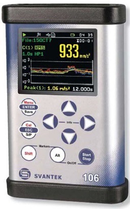 SV106 революционный портативный прибор, позволяющий выполнять измерения одновременно двумя трех осевыми акселерометрами общую и локальную вибрацию, а также выполнять анализ вибрации в 1/1 или 1/3 октавных полосах частот одновременно по всем шести каналам.