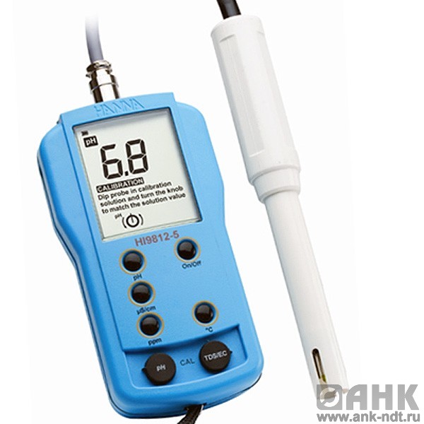 HI 9812-5N PH-метр / кондуктометр / термометр портативный водонепроницаемый c автоматической термокомпенсацией, датчиком, батареей на 9V, особенностями эксплуатации при температуре 0:50°C и влажности до 100%.