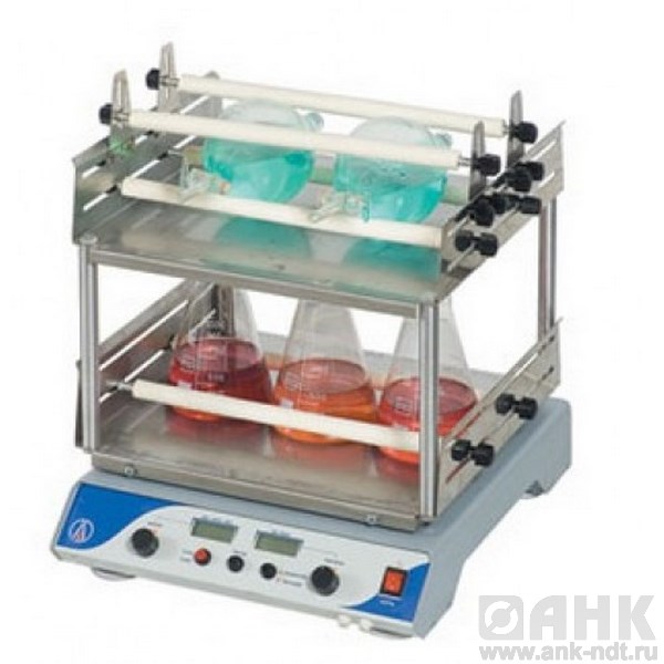 Микропроцессорный контроллер, снабженный таймером, позволяет задавать необходимые условия перемешивания любых жидких компонентов в колбах, делительных воронках, пробирках и другой лабораторной посуде.
