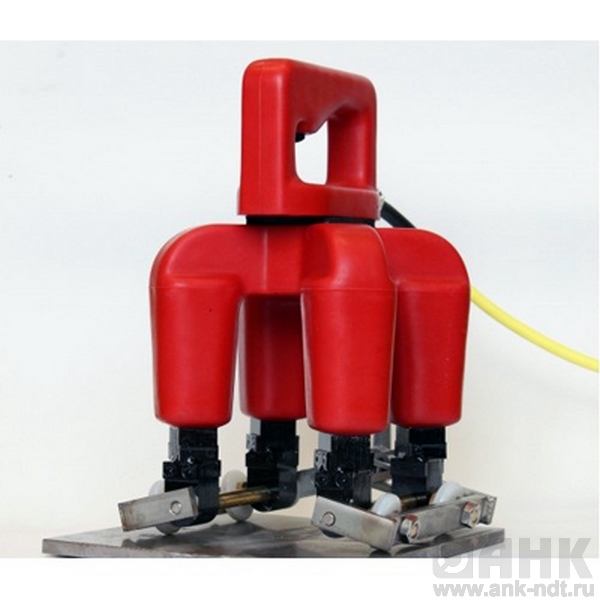 Электромагнит KWM 42 состоит из 2-х электромагнитов, смещённых на 90° относительно друг друга, для того, что бы за одну операцию выявить как продольные, так и поперечные трещины. Два ролика на каждом магнитном полюсе поддерживают постоянный воздушный промежуток, что облегчает перемещение электромагнита по испытуемой поверхности.