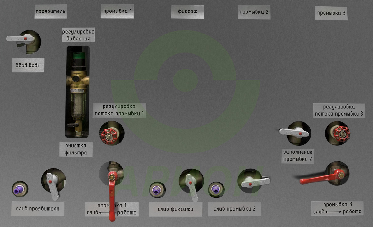 Установка снабжена фильтром очистки водопроводной воды, циркуляционным насосом для перемешивания проявителя, пультом управления с тремя таймерами для контроля времени проявления и фиксации.