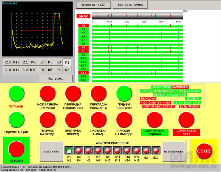Контроль происходит в полностью автоматическом режиме, при котором механическая часть установки обеспечивает последовательное перемещение прутков из устройства загрузки через стол накопитель и торцеватель рольганга в акустический узел, после которого они попадают в узел разбраковки.