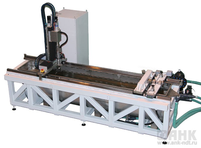 Система состоит из станины с иммерсионной ванной, приводом вращения и узлом поджима вала, сканера, системы водоподготовки, системы управления электроприводами, ультразвукового дефектоскопа, ПК управления и регистрации.