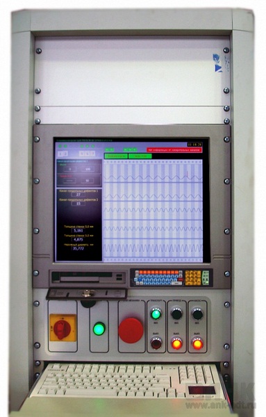 Информация от измерительной части поступает в реальном времени на управляющую ЭВМ и выводится на экран в виде ленты электронного самописца. Управляющая ЭВМ расположена в стойке регистрации. Программное обеспечение, работающее под управлением операционной системы Windows XP, выполняет задачи отображения и регистрации результатов контроля измерительной части установки, ведёт электронный журнал работы установки, а так же сохраняет на жесткий диск результаты УЗ контроля в виде протоколов для дальнейшего просмотра и вывода на печать.