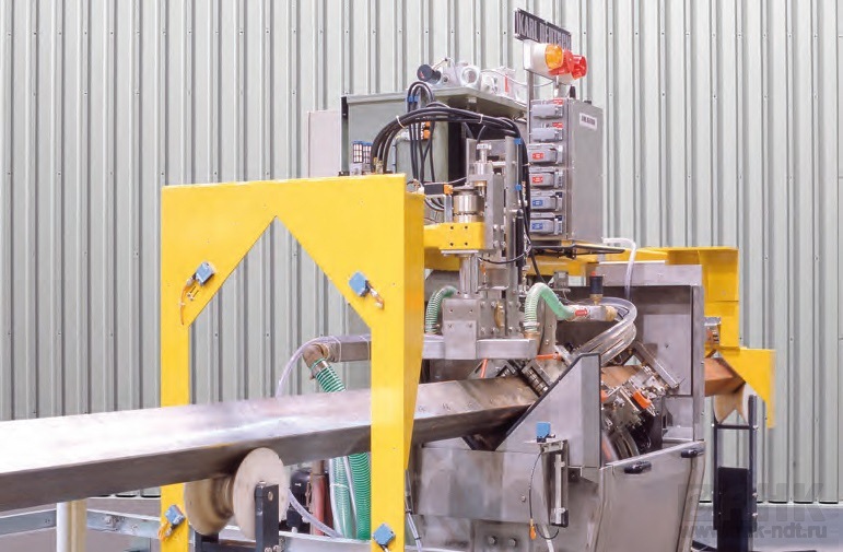 Ключевой пункт контроля заготовок труб – это контроль их соединений. Ультразвуковой контроль с применением управляемых водяных форсунок практически не изнашивает держатель и позволяет быстро изменять диаметр оцениваемых заготовок. Эта технология так же называется омывающей и использует водяную прослойку между датчиком и заготовкой. Расстояние между датчиком и поверхностью трубы составляет несколько сантиметров, благодаря чему датчик практически не изнашивается. Вместо двухэлементных датчиков (использовавшихся в старых системах) используются датчики иммерсионного типа с широким диапазоном. С применением метода дистанционно-амплитудной коррекции достигается одинаковая чувствительность для любой глубины.